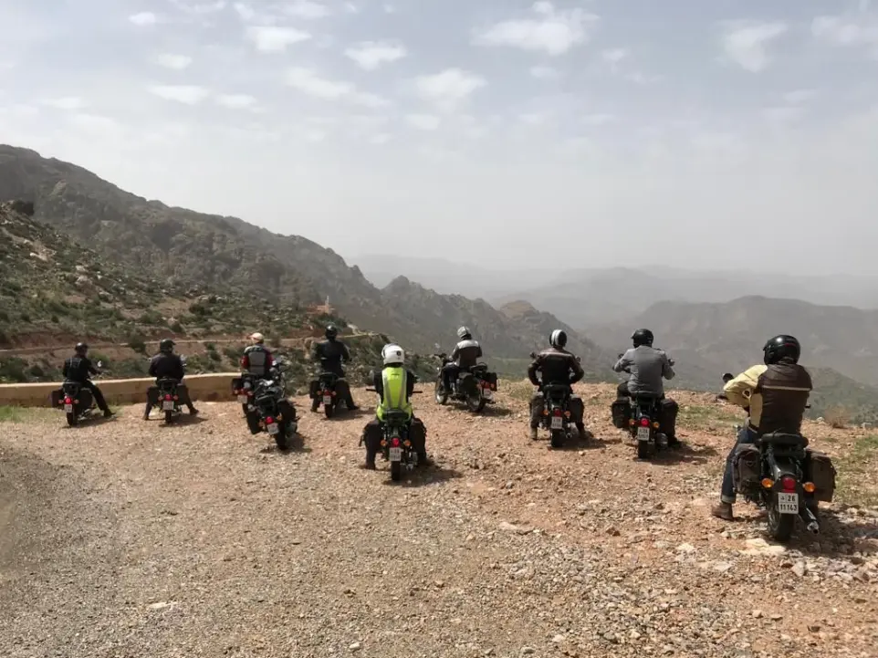 Casques bouclés, moteurs lancés : c’est le grand départ vers l’Atlas et le sud marocain. La route s’élève progressivement jusqu’au mythique col de Tizi n’Test, où nous ferons une pause pour admirer l’un des panoramas les plus spectaculaires du royaume. Un moment parfait pour respirer, prendre quelques photos et savourer la magie des hauteurs.