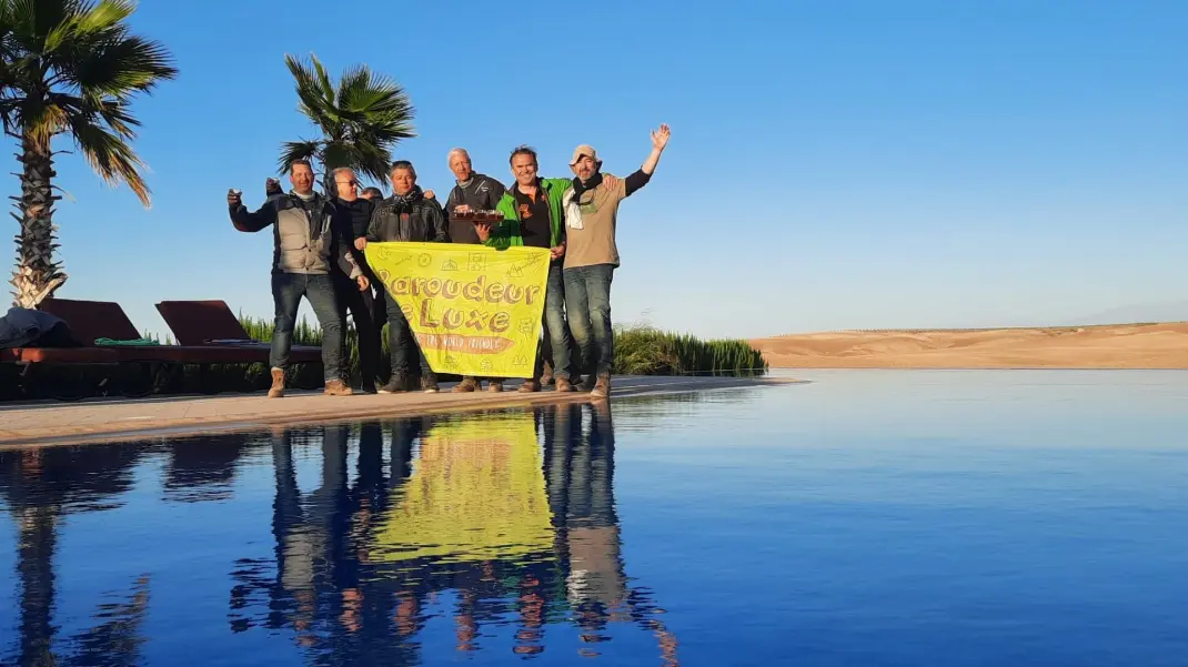 Depuis le désert d’Agafay, nous reprenons les motos pour rejoindre Marrakech, notre point final. La route nous fait quitter peu à peu les paysages minéraux et arides pour retrouver les plaines verdoyantes et les palmeraies qui annoncent l’approche de la ville rouge. Chaque kilomètre rapproche du tumulte de Marrakech : les villages, les marchés et la vie qui s’agite autour des routes contrastent avec le calme et la solitude du désert. Mais ce contraste fait partie de la magie du voyage : après des jours d’aventure, de liberté et de grands espaces, retrouver la ville offre un sentiment de retour, enrichi par toutes ces expériences vécues sur la route.
